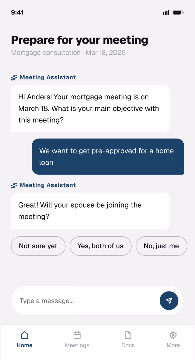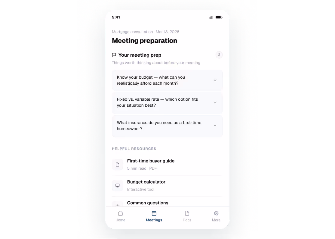 Required documentation is requested and validated before the meeting. You reduce risk and increase transparency across advisory flows.